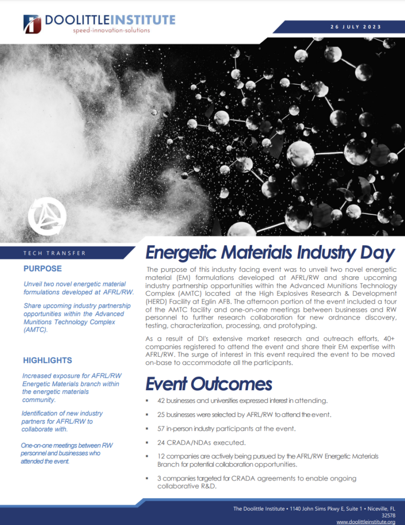 The Air Force Research Lab Munitions Directorate (AFRL/RW) Energetic Materials Branch, in collaboration with Doolittle Institute, is hosting an Industry Day to showcase upcoming partnership opportunities within the Advanced Munitions Technology Complex (AMTC) located at the High Explosives Research & Development (HERD) Facility at Eglin AFB.